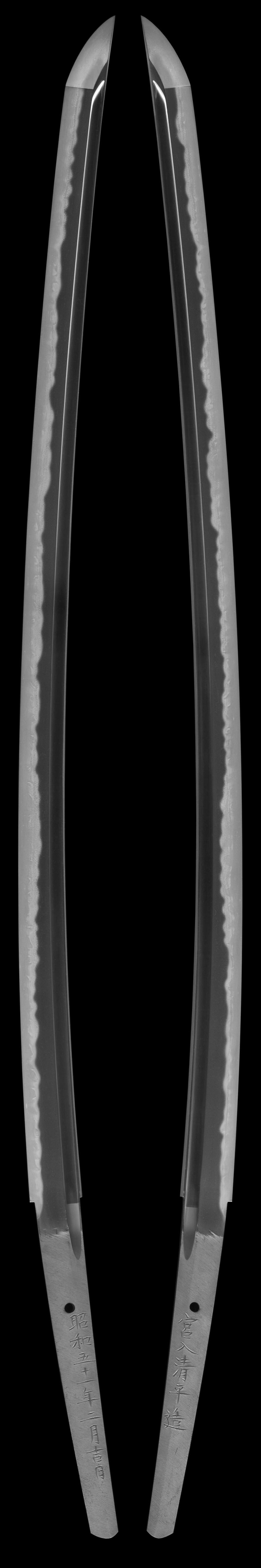 宮入清平(清宗)は、大正十三年に長野県坂城生まれる。宮入行平(人間国宝)は実兄にあたり、昭和十四年に作刀入門している。号銘は『清平』であり、郷土の先達刀工である源清麿から一字、兄の昭平(行平の前名)から一字をとり名乗った。近在の上田市鍛冶町は江戸時代後期から、清麿の兄にして師匠でもある山浦真雄(寿昌)が作刀した地である。上田鍛冶町には刀職関連の職人が多く、山浦真雄の実見談家伝が兄行平に伝ったそうである。清宗はその頃行平の弟子であり、鍛刀用の炭俵を上田から坂城までリアカーで運んでいたという。清平は昭和三十四年に文化庁から作刀許可を得て独立、坂城町に鍛冶場を設けた。宮入一門の造刀法は山浦一門と同じく最も高度な『本三枚作』である。刀の棟に心鉄を使い、刃側に刃鉄を入れ、両側を硬い皮鉄でサンドイッチの様に挟み覆う。鉄の種類も増え、沸しが難儀で火加減では鍛割れが出やすい。だが本格的鍛造方で、山浦・宮入両門の相州伝はこの技法である。行平・清平の兄弟が私淑した清麿の作から範をとったものであり、両者が清麿の刃寄りに柾目がかかり刃中に金筋砂流しが現れて荒沸のつく相州伝を追い求めていた事は明らかである。清平は特に清麿に迫った作域を実現した刀工である。平成元年に銘号を『清宗』に改めるが、宗の字は巨匠相州貞宗から一字をとったものである。相州伝の巨匠貞宗と、新々刀の天才である清麿を追い求めた、隠れたもう一人の天才であるといえよう。