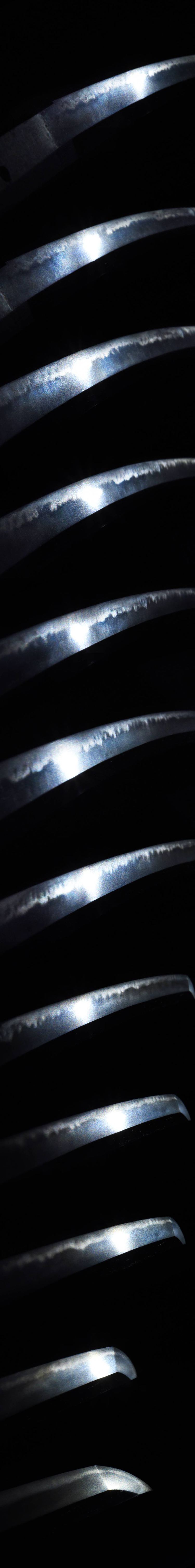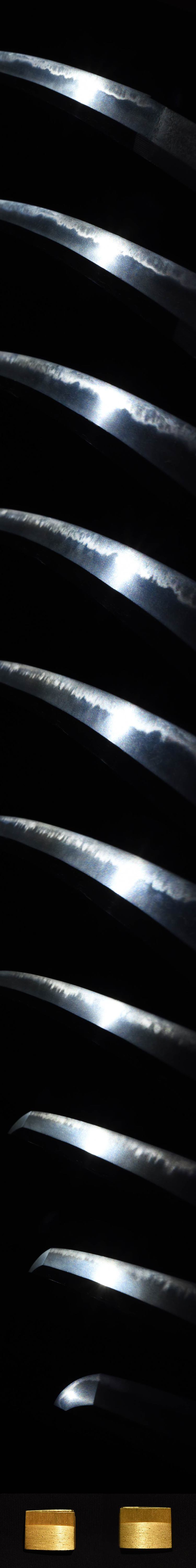 『刃文』小乱れ主張に小丁字・丁字交じり、部分的に逆がかり、足・葉入り、匂口深く、厚く沸づき、砂流しかかり、上半に湯走り・下半に金筋入る。
