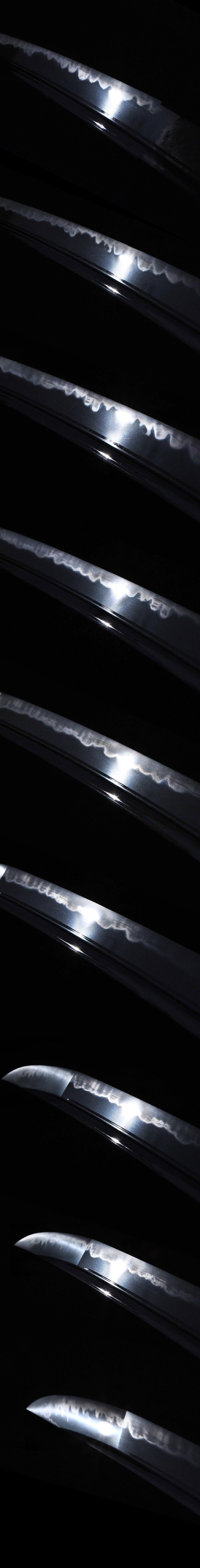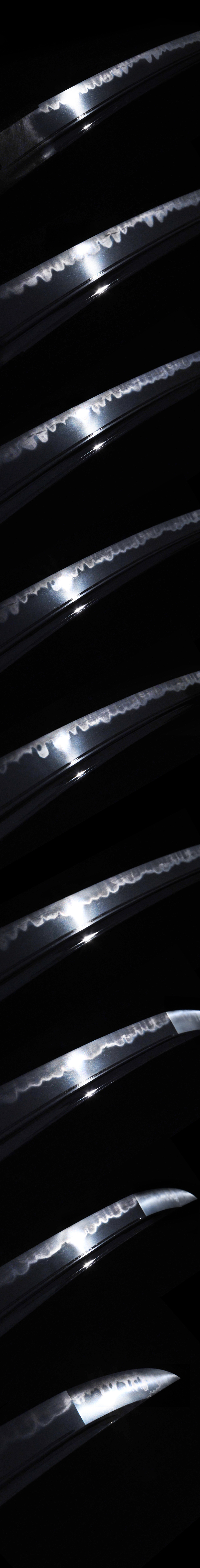『刃文』互の目乱れに丁字風の刃・尖り刃など交じり、華やかとなり、足が長く入り、匂深で、沸が厚くつき、荒めの沸を交えてむら立ち、湯走り入り、金筋・砂流しが幾重にも頻りにかかり、匂口明るく冴える。