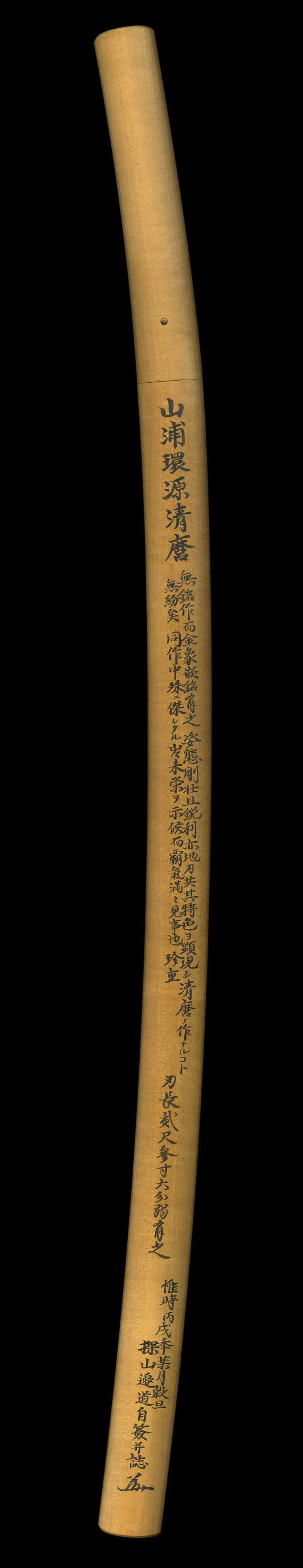 山浦環源清麿は、本名を山浦内蔵助環といい、文化十年、信州赤岩村(現長野県小諸市)に生まれた。文政十二年に兄、真雄と共に上田藩工河村寿隆の門に入り、初名を「一貫斎正行」と名乗った。天保五年、師、寿隆から贈られた「秀寿」銘を用いたが、何故か同年のみでまた「正行」銘に戻っている。天保六年、江戸に出て、幕臣で兵法家として名高い窪田清音のもとで学び、天保十三年八月から長州萩で一年間作刀している。弘化二年、再び江戸に戻り、同三月秋には、「正行」銘から「清麿」銘に改めた。嘉永七年、四十二歳で自刃した。