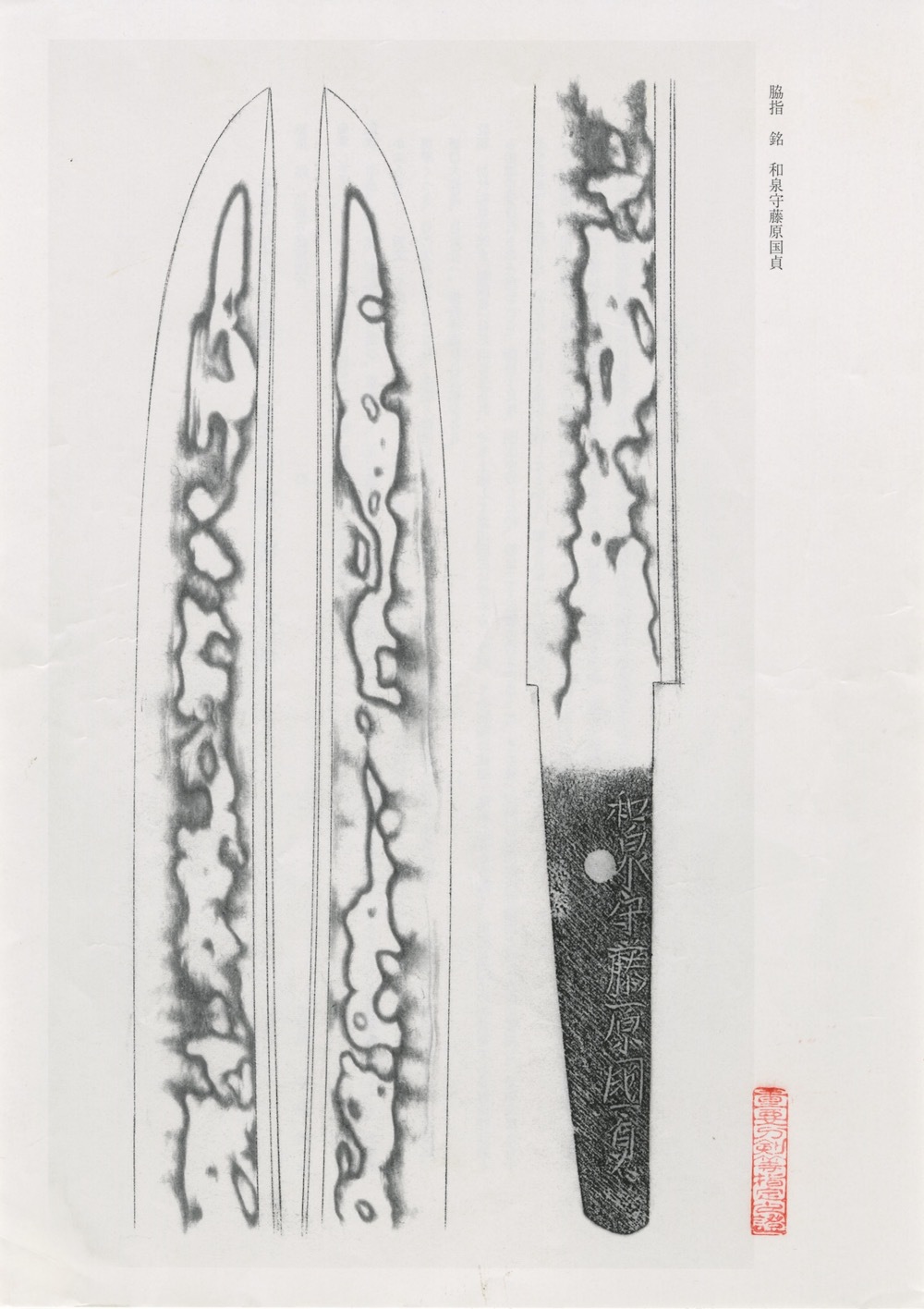 この脇指は、初代国貞には極めて珍しい皆焼を焼いたもので、こうした作風は、経眼稀である。小板目が詰み地沸の微塵に厚くついた鍛えに、刃文は小湾れに互の目・尖りごころの刃等が交じり、皆焼・棟焼を交えて皆焼となり、匂深く、沸厚くつき、金筋・砂流しかかるなど、華やかな出来口に仕上がっている。相州の広光・秋広、或いは山城の長谷部あたりに私淑したものであろうか、資料性の高い出色の出来映えを示した見事な一口である。