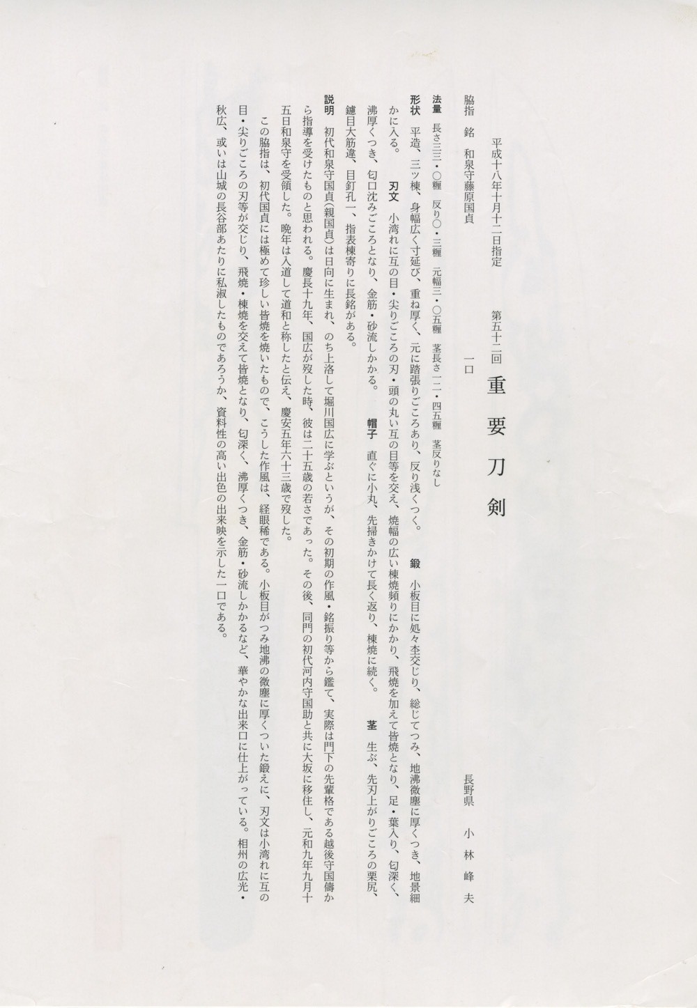 日本刀 鑑定書『日本美術刀剣保存協会 重要 刀剣』 NBTHK 『Juyo Paper』