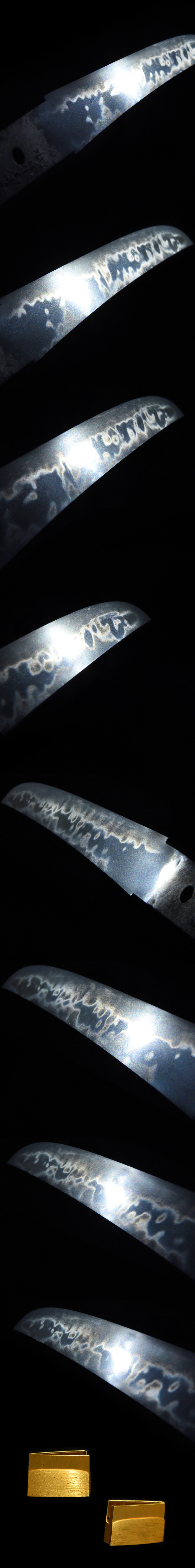 『刃文』小湾れに互の目・尖りごころの刃・頭の丸い互の目等を交え、焼幅の広い棟焼頻りにかかり、飛焼を加えて皆焼となり、足・葉入り、匂深く、沸厚くつき、匂口沈みごころとなり、金筋・砂流しかかる