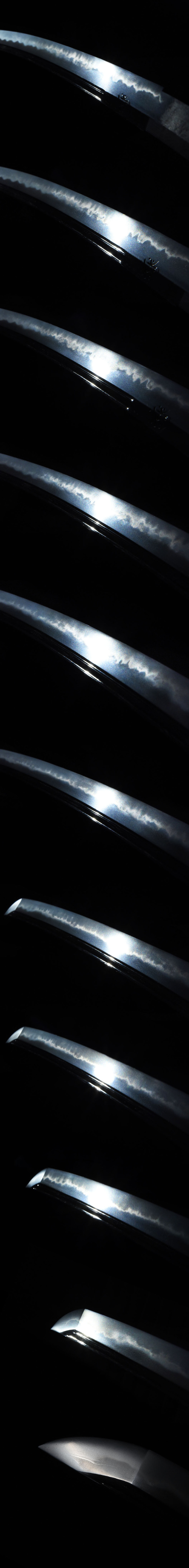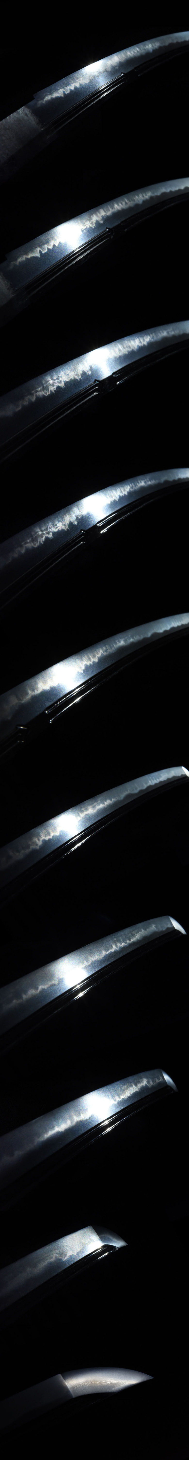 『刃文』互の目乱れに角ばる刃・頭の丸い互の目・尖刃等を交り、足が長くよく入り、沸が厚くつき、総体に砂流しがかかり、随所に太い金筋が入り、匂口明るく冴える。